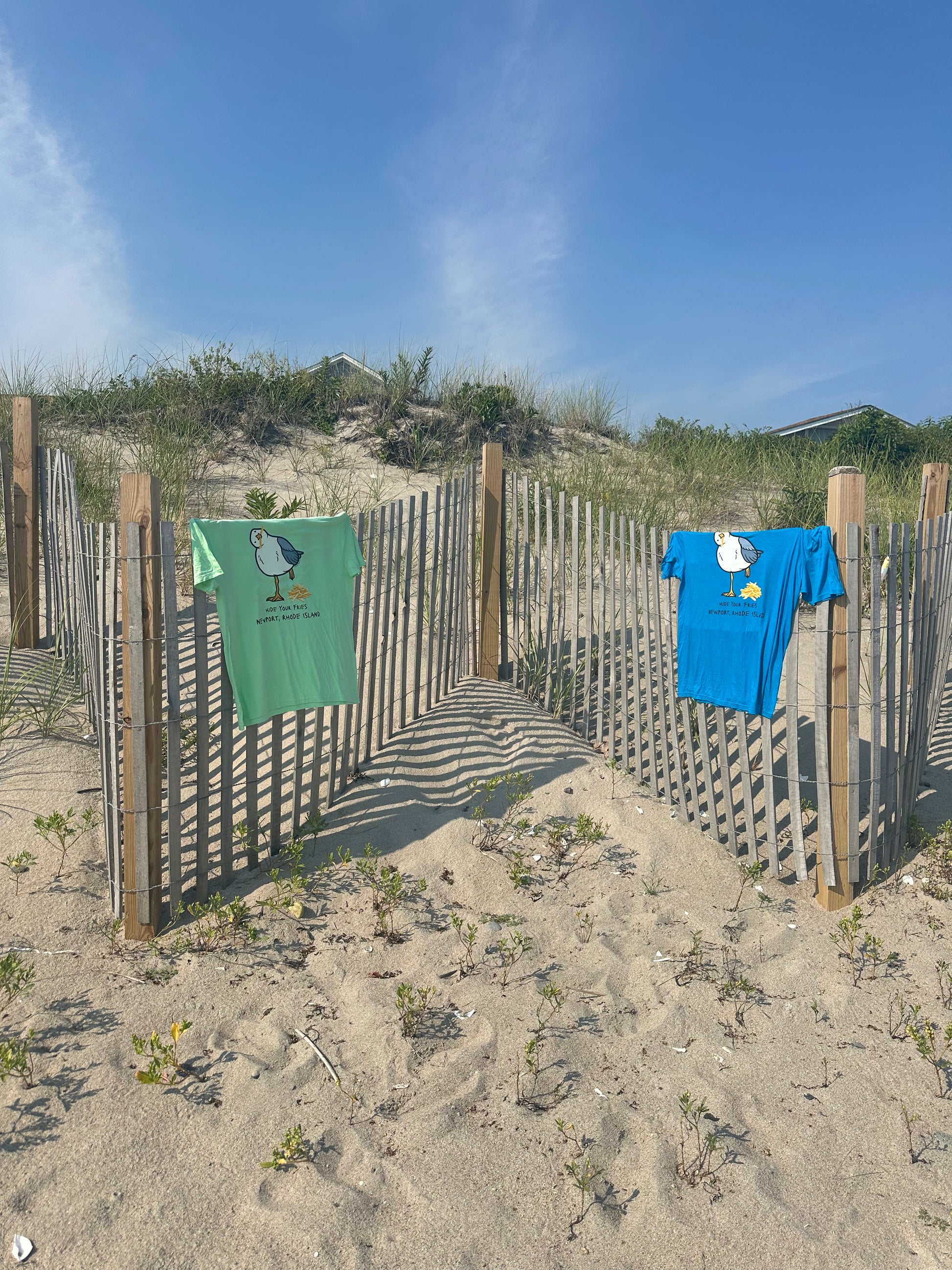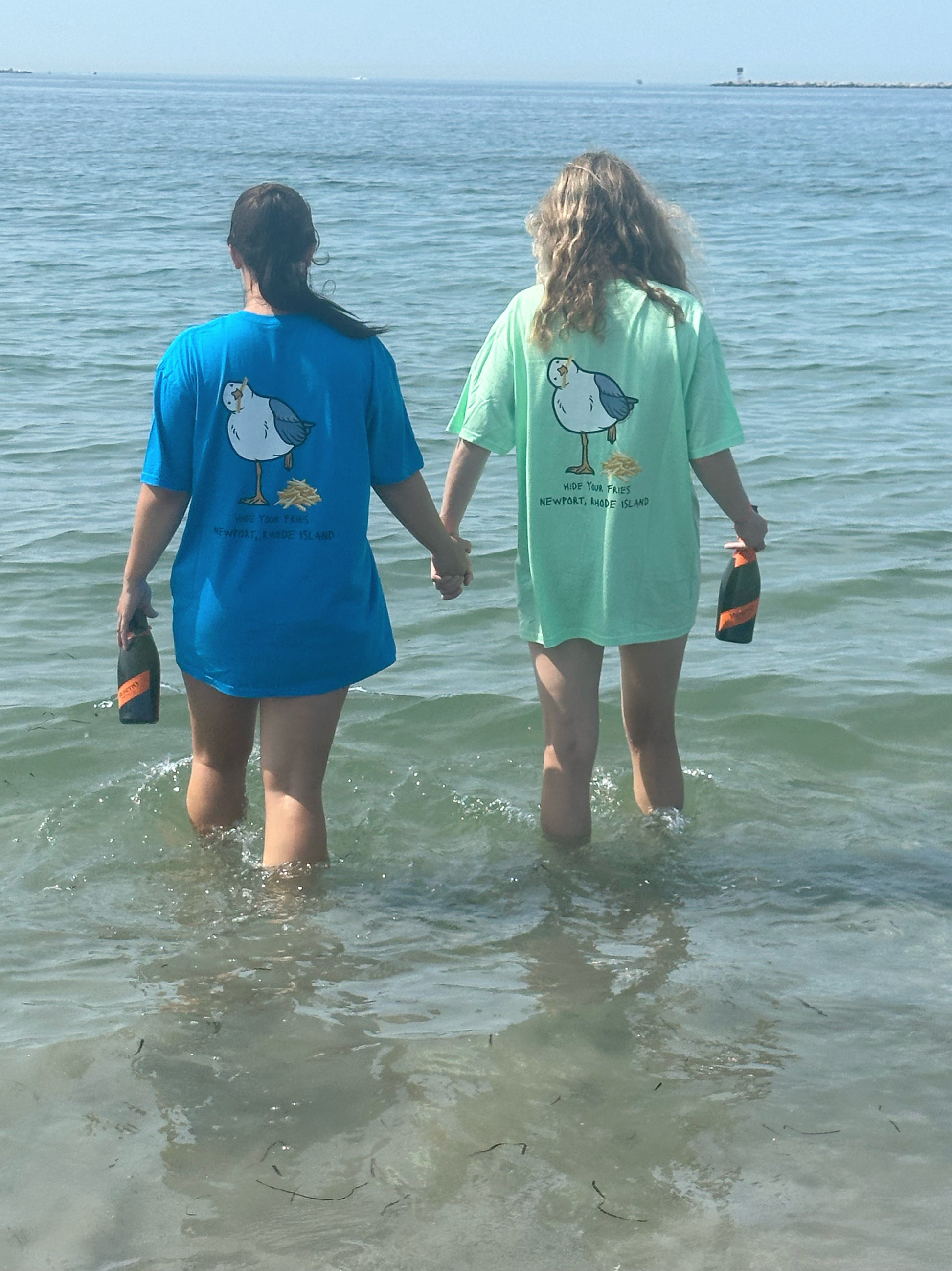 Our Hand designed Vitamin Sea & Co. Sea Gully T-shirt, was inspired by artist, Kirstin's, nickname as a kid "Gully" because she loved food so much like seagulls. The "Hide Your Fries" slogan is brought to you buy the every person who has ever been to the beach were the sea gulls will steal food right out of your bare hands....or mouth.Â