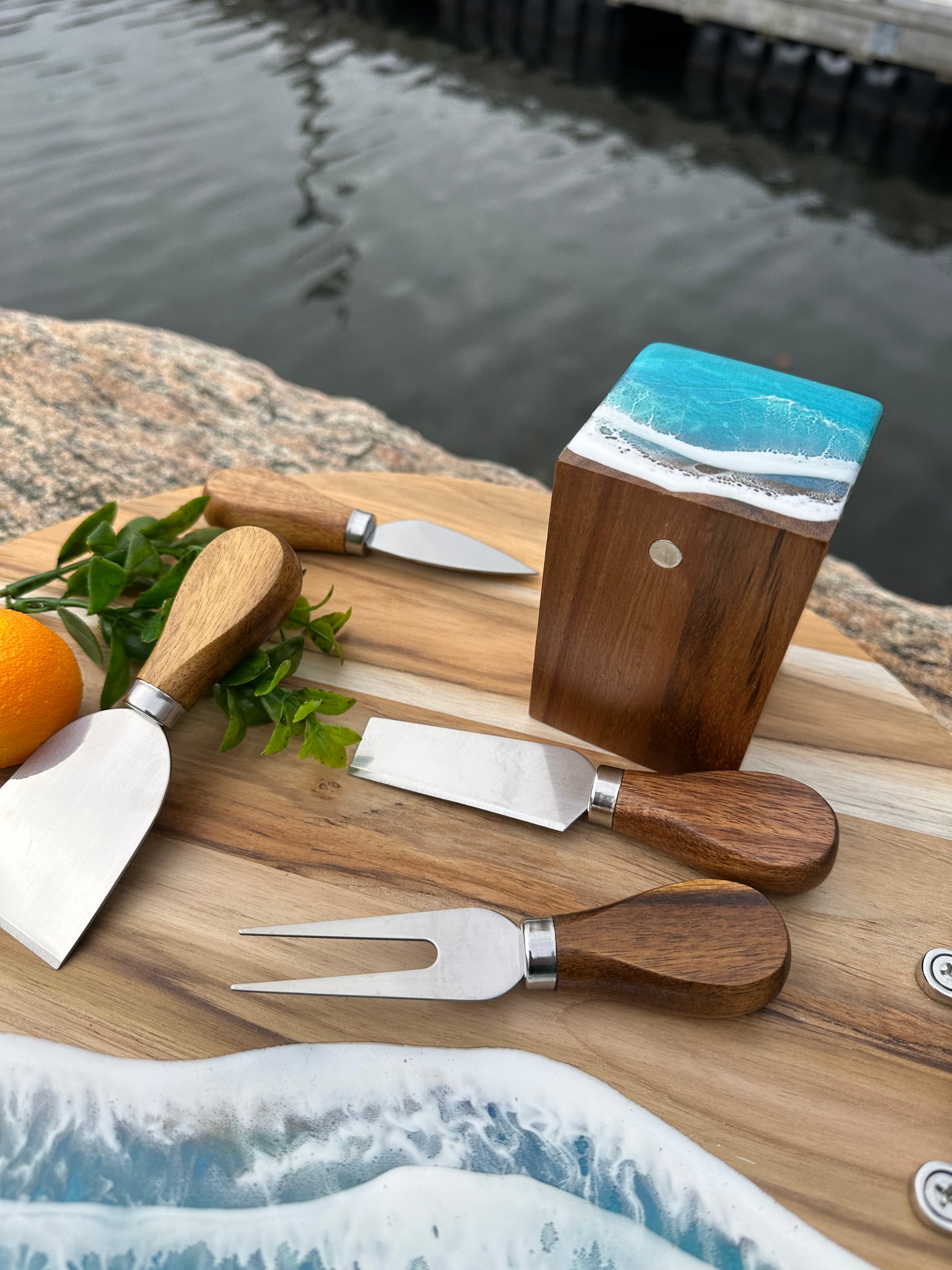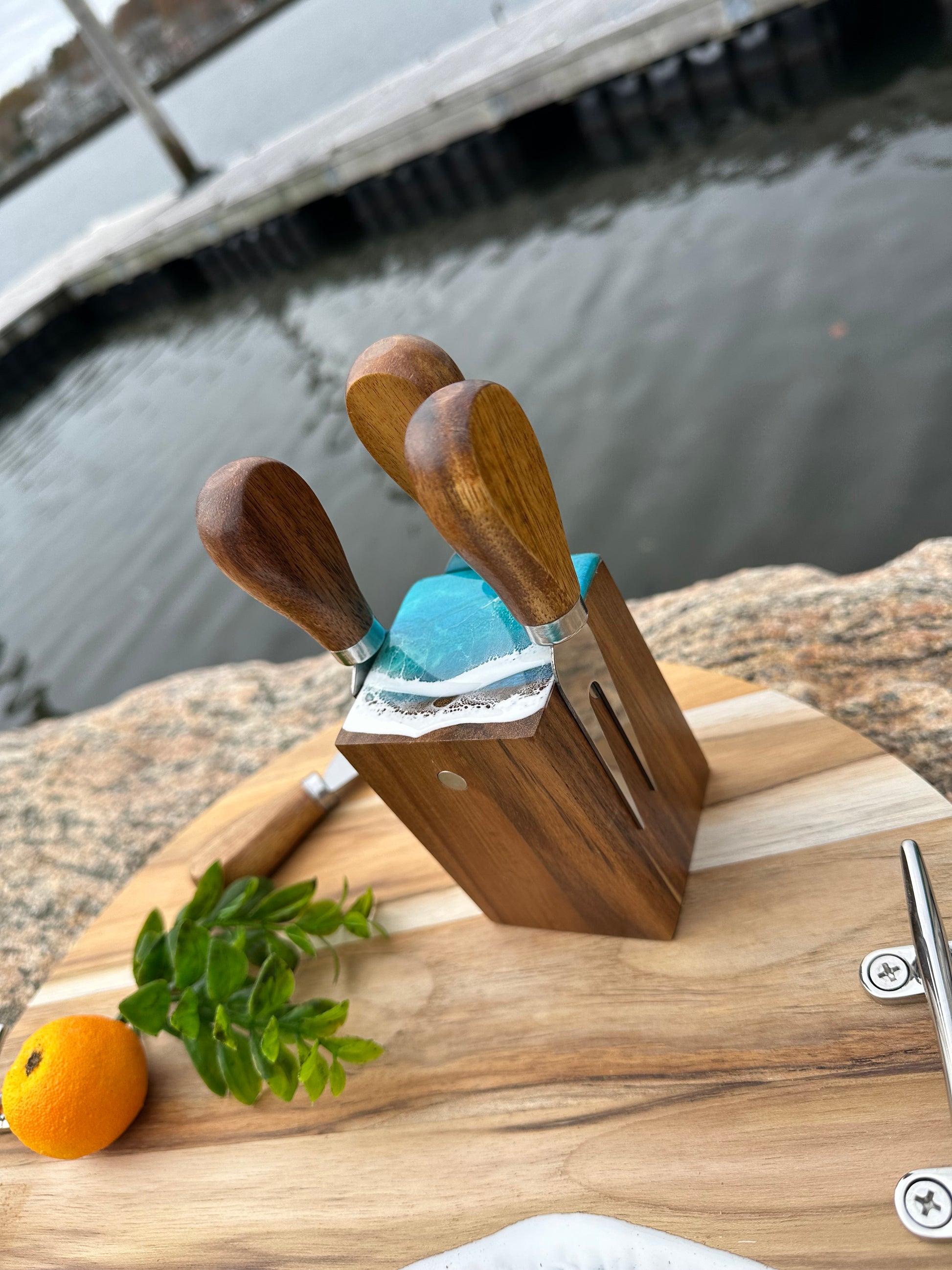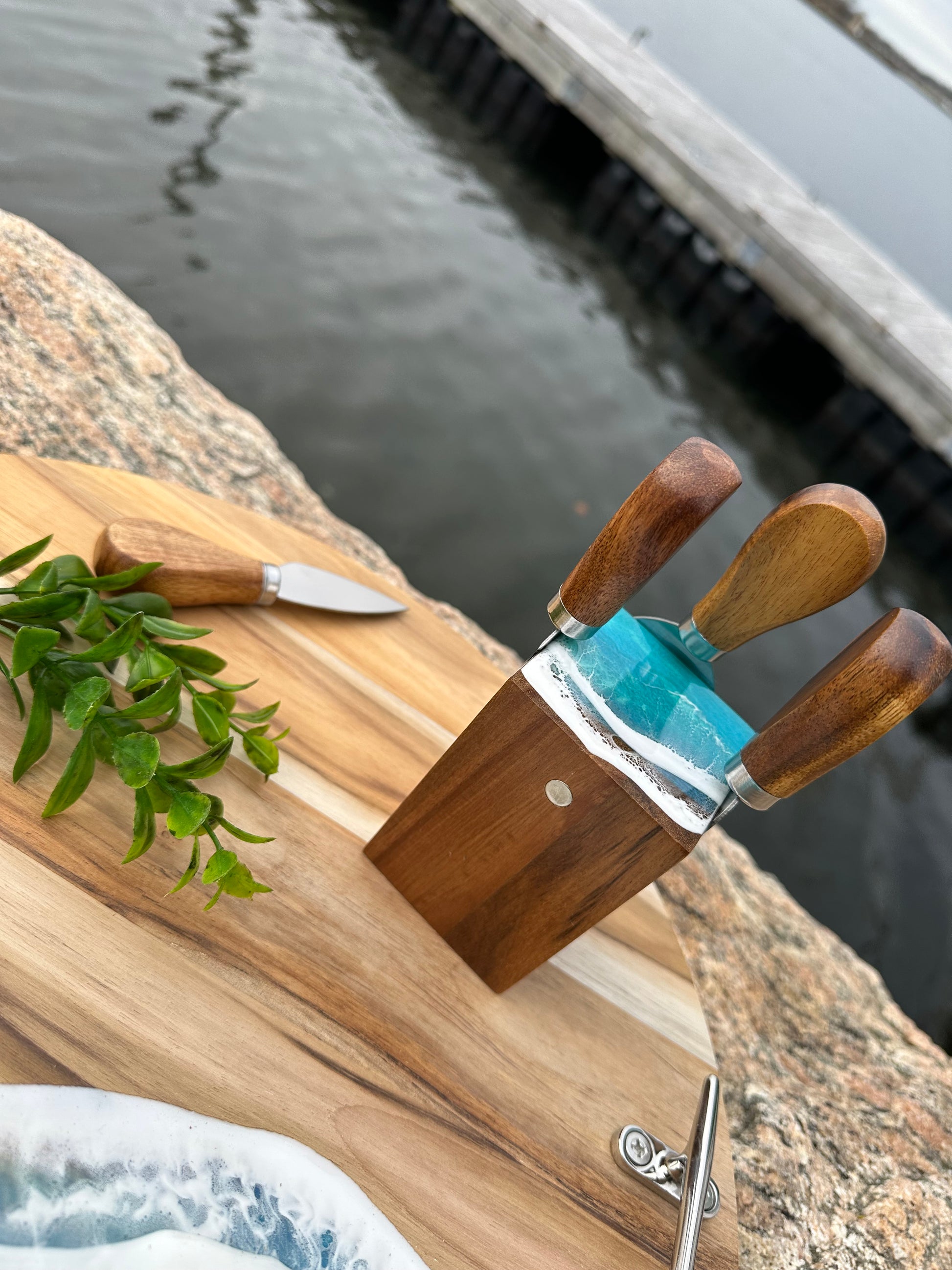 Knives for all your variety of cheeses, with magnetic holder to keep an aesthetically clean and classy charcuterie board with a nautical touch of your choice of wave. Available in New England Dark blue or Floridian Turquoise Green.