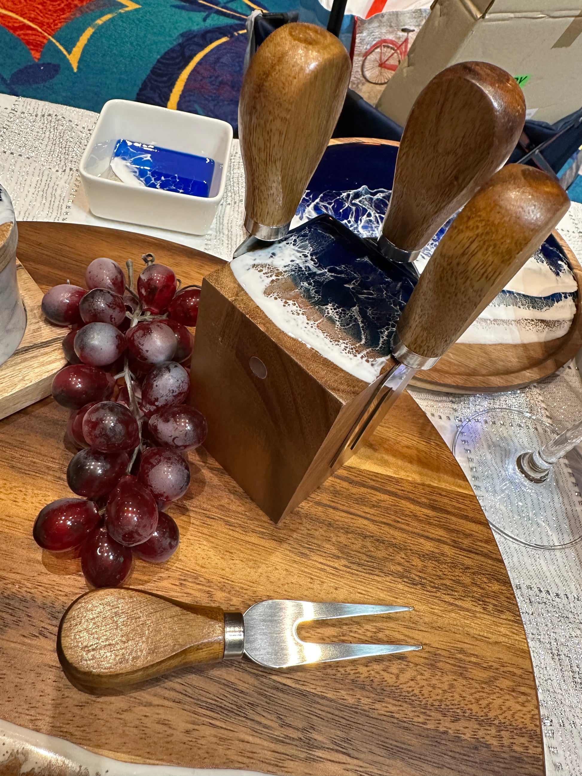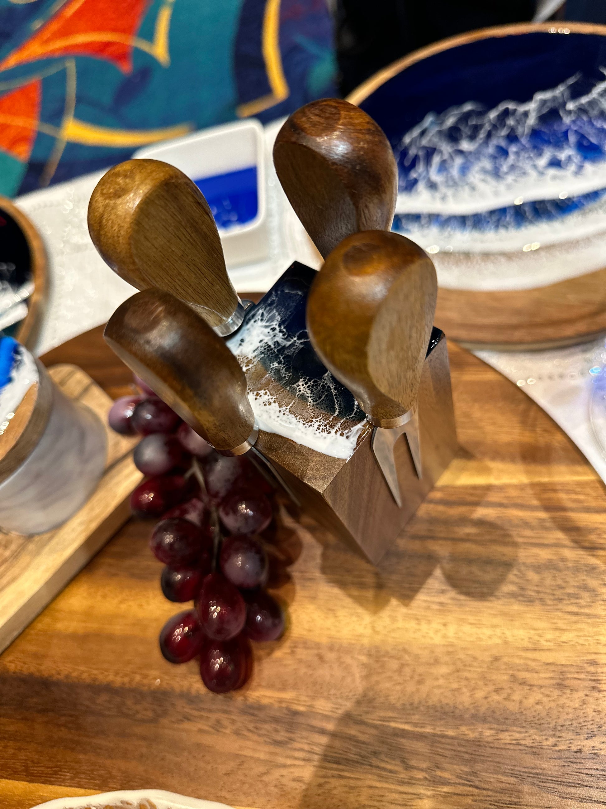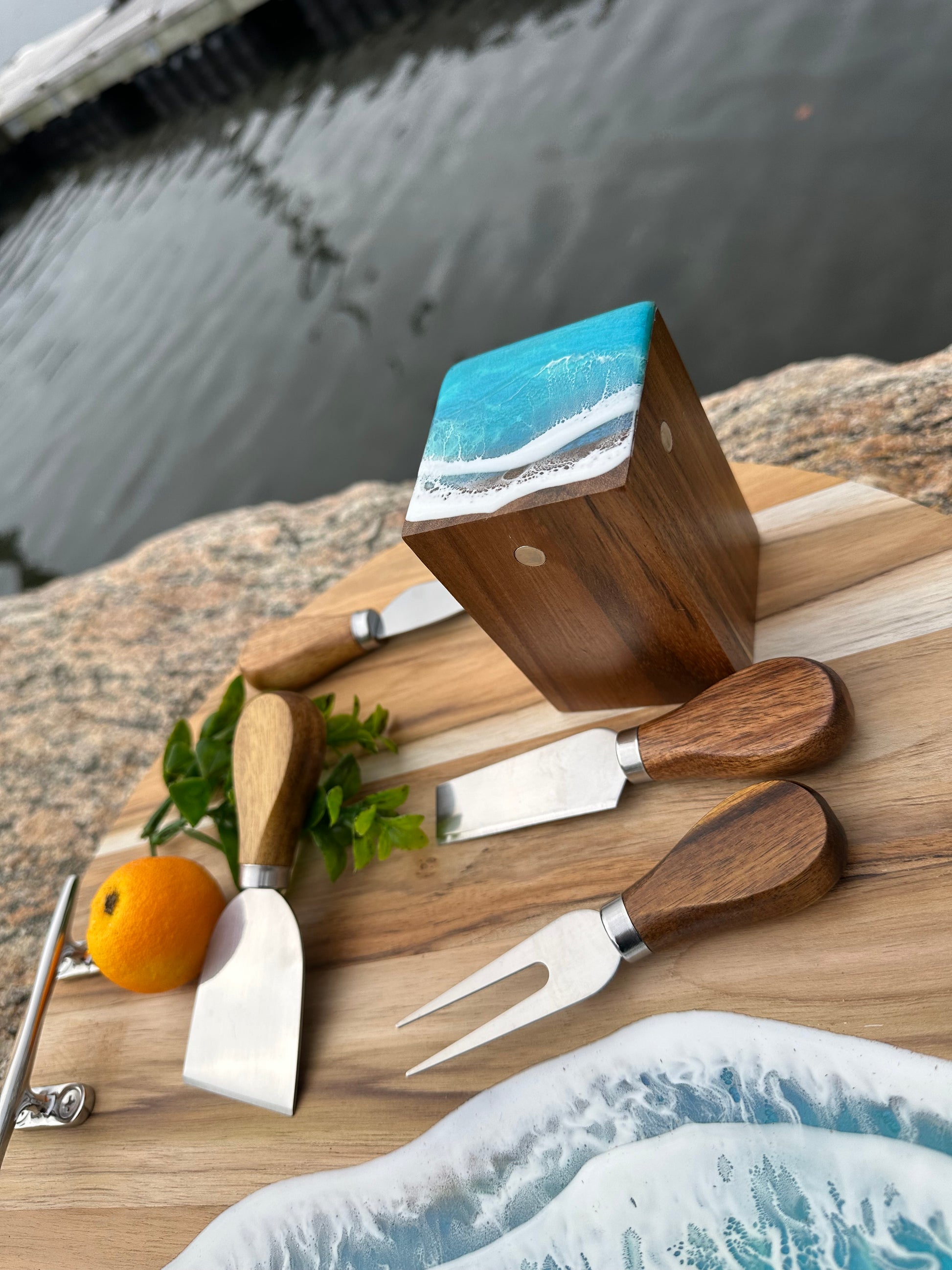 Knives for all your variety of cheeses, with magnetic holder to keep an aesthetically clean and classy charcuterie board with a nautical touch of your choice of wave. Available in New England Dark blue or Floridian Turquoise Green.