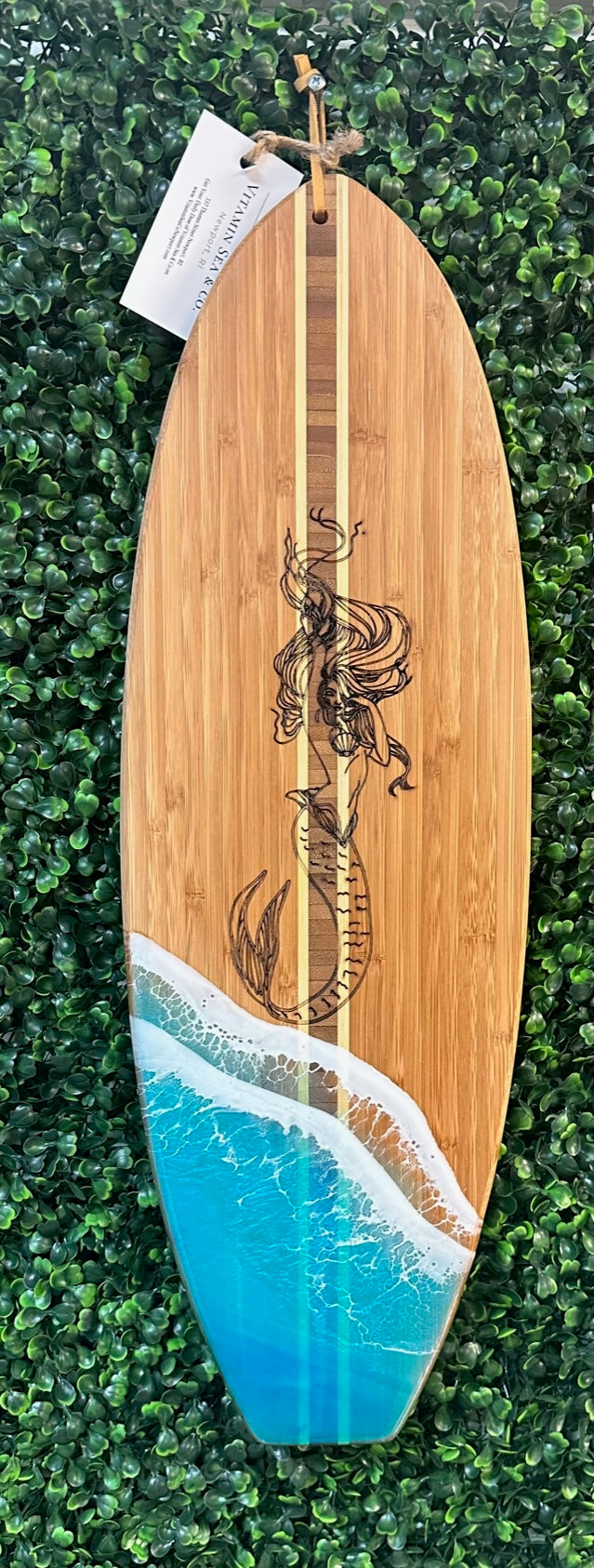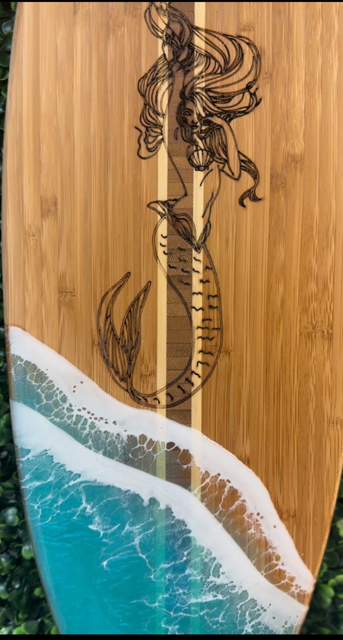 Engraved Mermaid; Pictured: Floridian Turquoise Green Resin Waves; Also available in New England Dark Blue waves